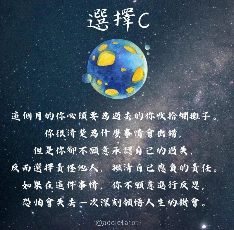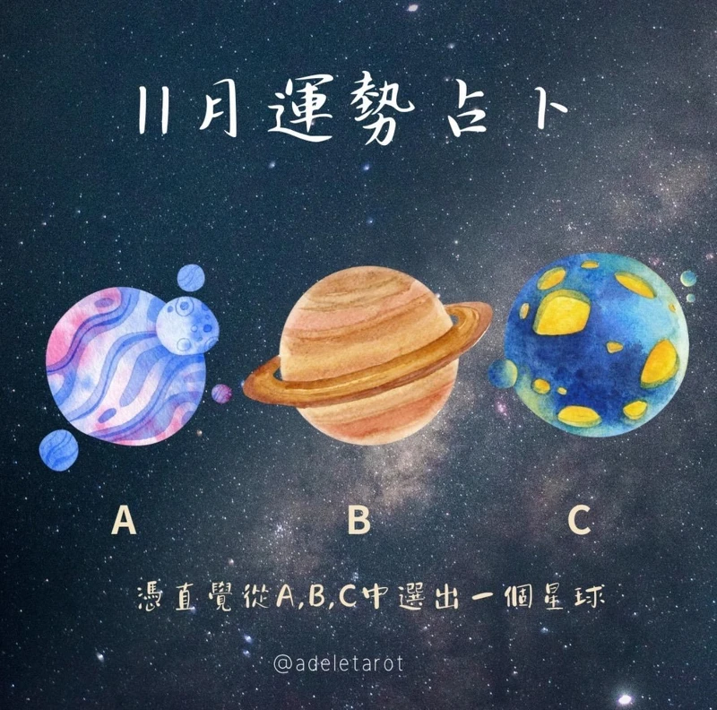 首先,我們先閉上眼睛,花幾秒鐘的時間讓心靜下來。準備好後,就可以睜開眼睛,從A、B、C三個選項中選出一間最喜歡的星球。