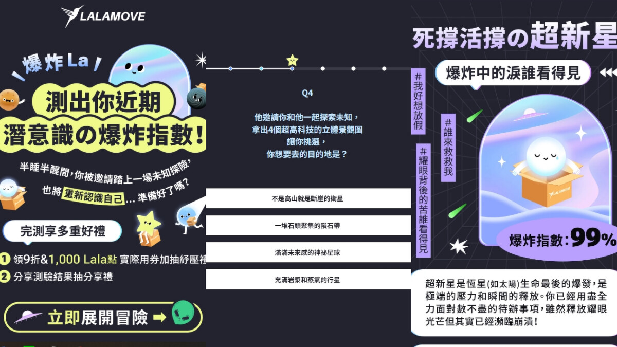 忙到爆炸的大家請暫時停下腳步,Lalamove推出的「爆炸La」讓你在短短8道題目中,就能測出潛意識的爆炸指數,充滿虛幻的夢境題目趣味十足,一起來你的分析精神壓力有多「爆炸」。