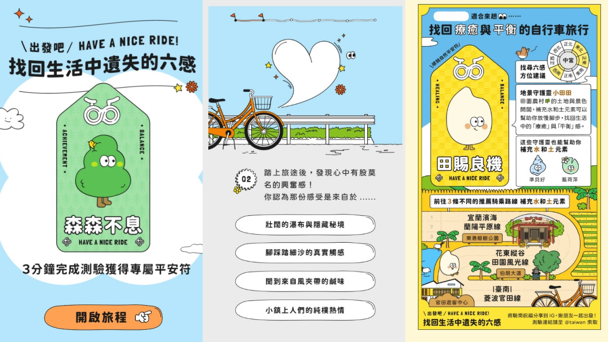 無論是喜歡廣闊無際海景、療癒田野山林、生生不息湖畔濕地或鬼斧神工山海線的凹豆咖,都一定要測測看~在經過一連串的自行車旅途後,會幫你找到最適合自己的療癒答案。