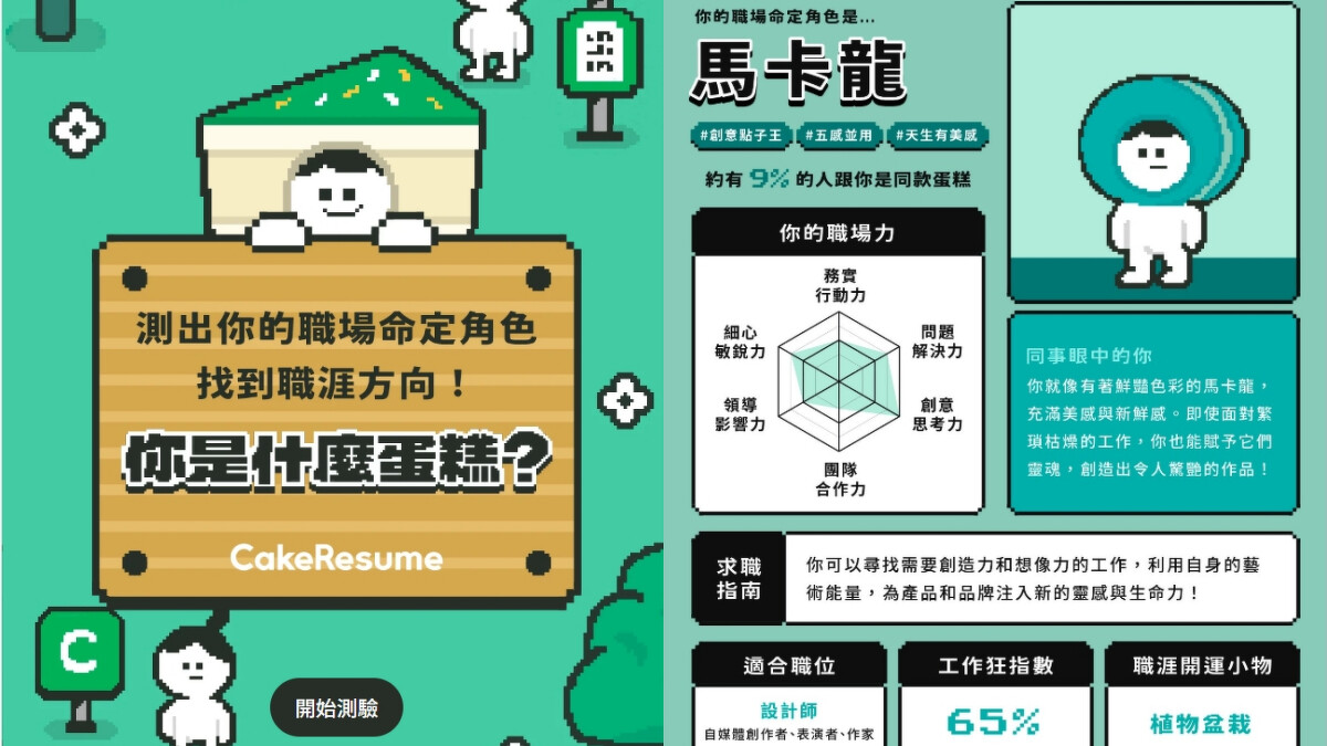 有求職需求的各位,可以玩玩這個心理測驗,能讓你正視對於工作各面向的期望。進入「求職新手村」後的多道題目,會幫你分析在職場上的命定角色,並給予量身打造的求職指南。