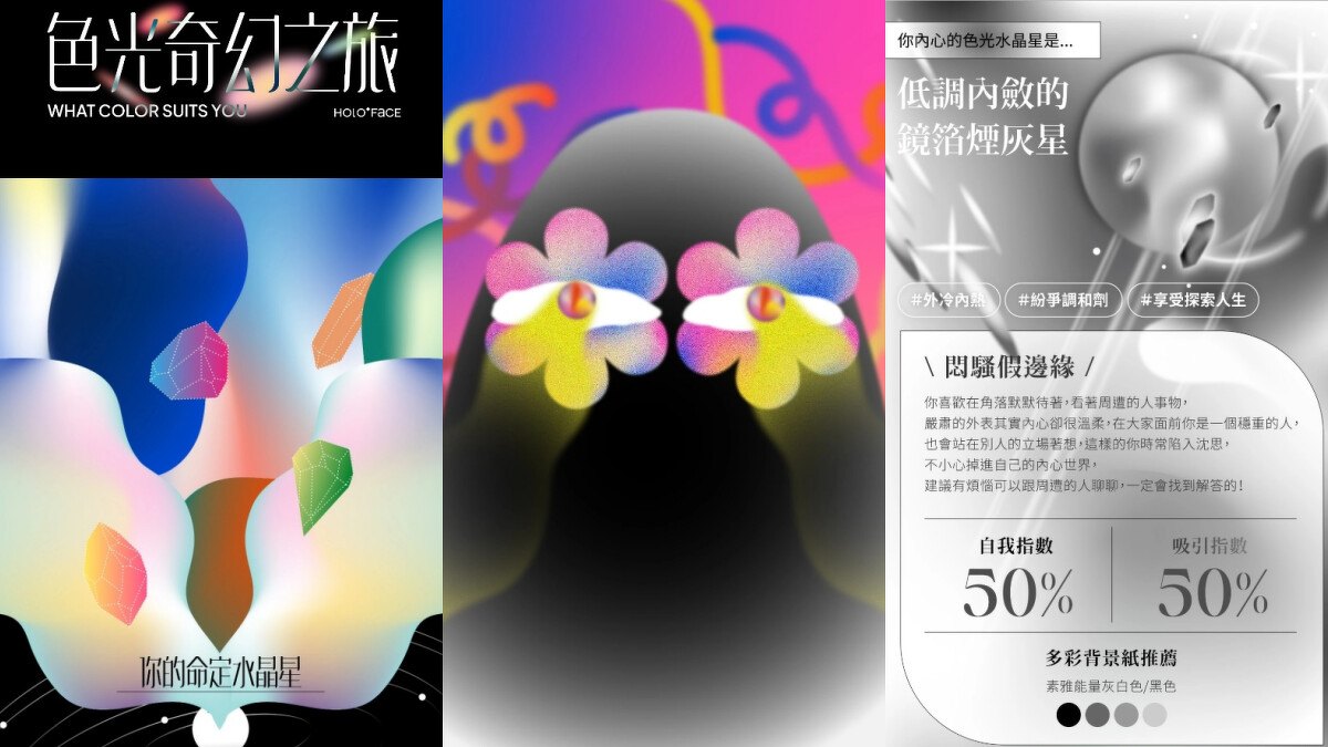 韓式證件照Holo+FACE推出的「色光奇幻之旅」,不只可以測驗形象和性格,還會為你找到最適合的顏色,請會隨著想像完成9道題目,獲得屬於個人色彩的超美漸層結果圖。