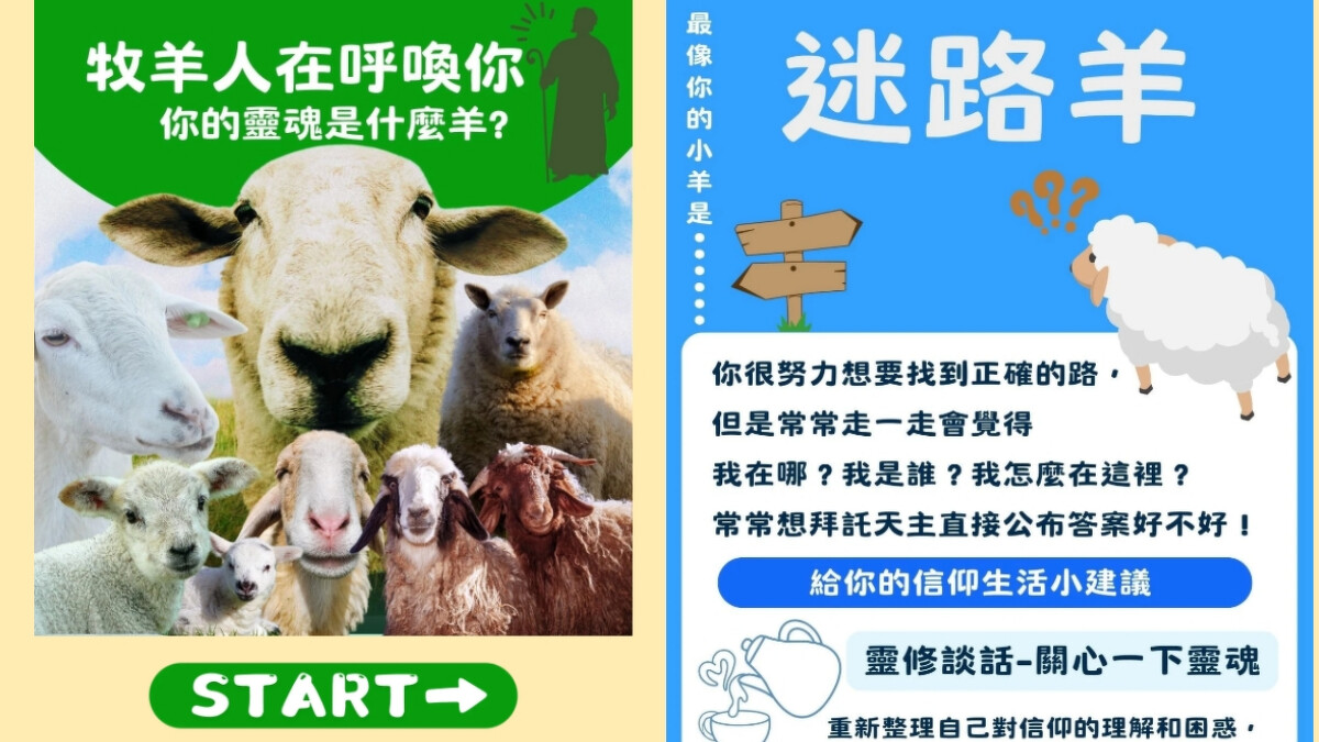 想知道靈魂裡住著什麼羊的大家,請跟上牧羊人的腳步,踏上一場冒險之旅,透過簡單的8道題目,找到最像自己的小羊,也可以找到靈魂伴侶、獲得一些信仰生活小建議。