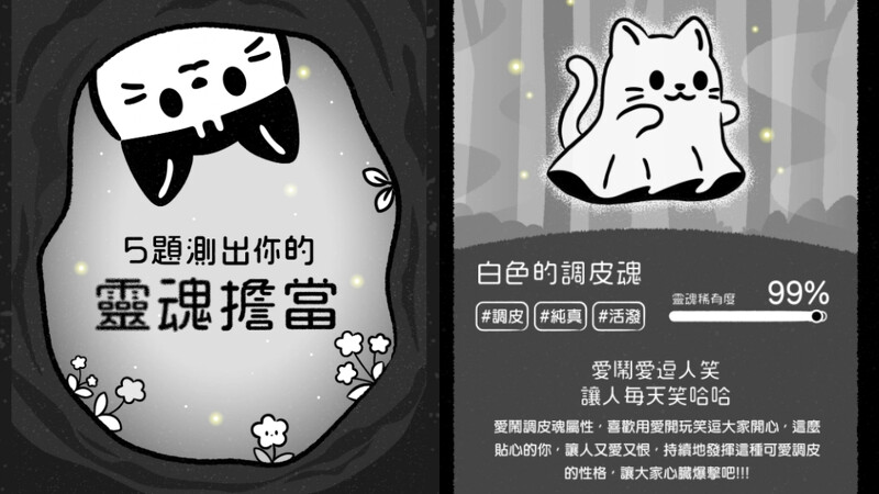 如果一覺醒來變成了貓⋯⋯你會怎麼在這座森林裡冒險呢?透過5道超可愛的題目,想像自己是隻貓,測出你的靈魂描述、速配魂伴、超雷魂伴和類型稀有度,還能獲得超萌專屬貓魂。