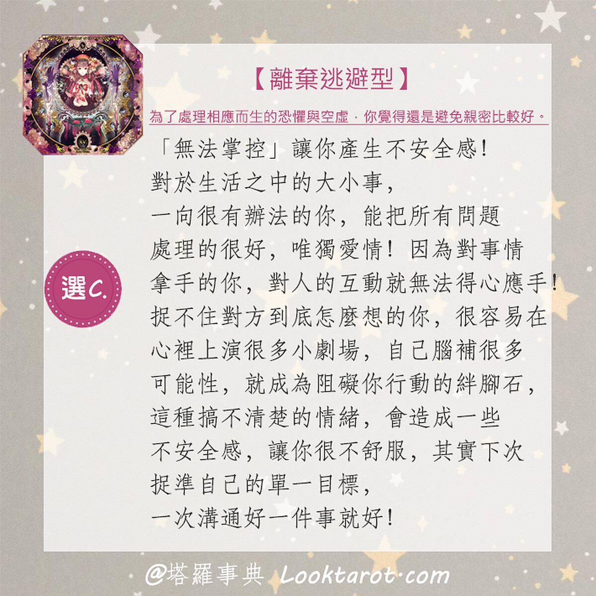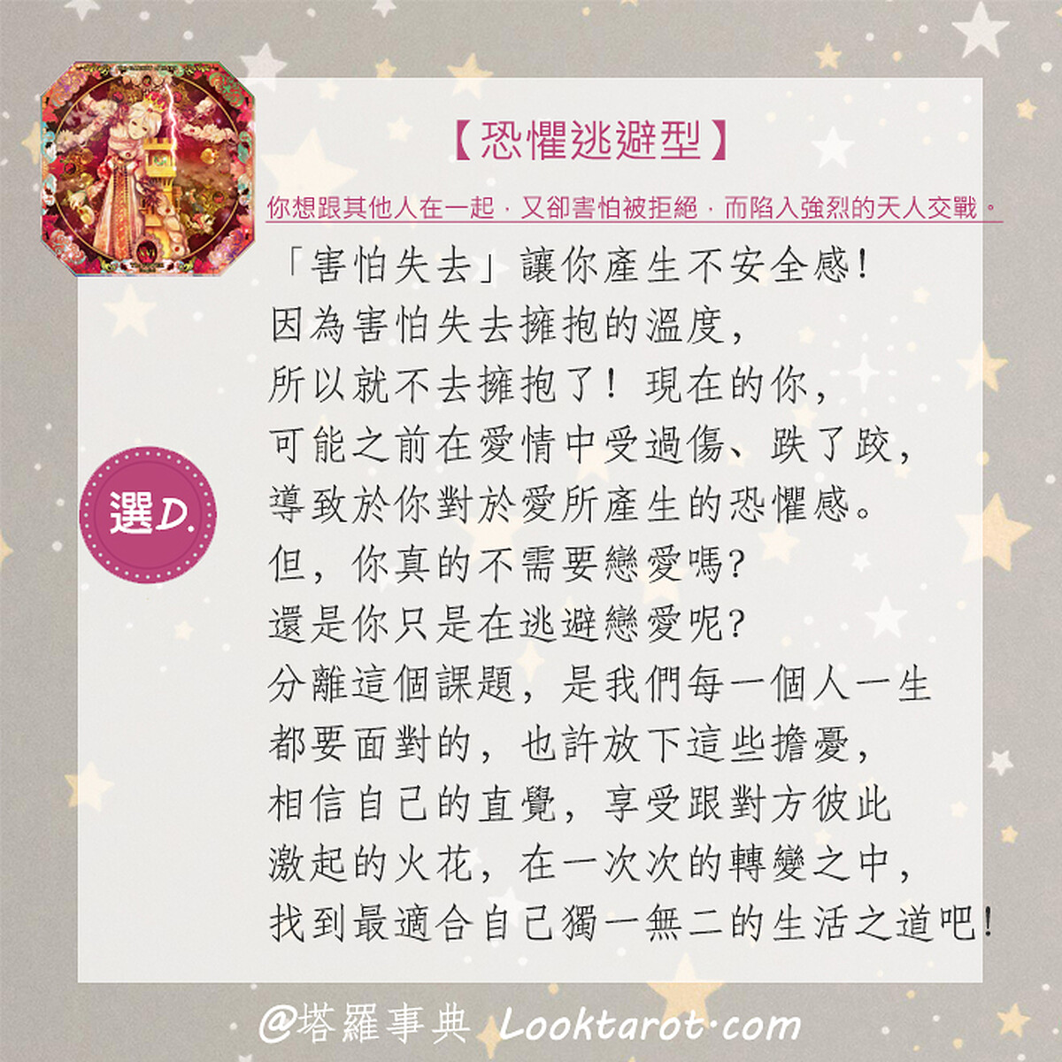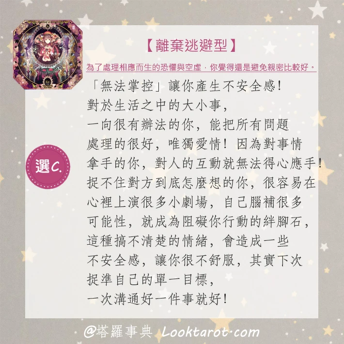 「害怕失去」讓你產生不安全感!因為害怕失去擁抱的溫度,所以就不去擁抱了!現在的你,可能之前在愛情中受過傷、跌了跤,導致於你對於愛所產生的恐懼感。但你真的不需要戀愛嗎?還是你只是在逃避戀愛呢?分離這個課題,是我們每一個人一生都要面對的,也許放下這些擔憂,相信自己的直覺,享受跟對方彼此激起的火花,在一次次的轉𤓖之中,找到最適合自己獨一無二的生活之道。
