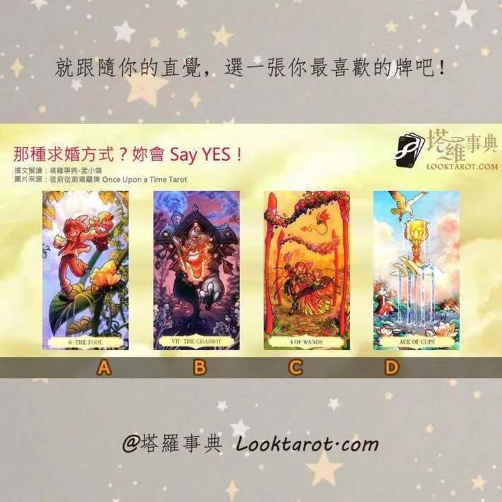每個女生在進入婚姻之前,都會想像男朋友會怎麼對自己求婚呢?妳期待的是跟偶像劇一樣浪漫的求婚,還是想他要簡簡單單溫馨的告訴妳,願不願意跟他走一輩子!到底那種求婚方式?能夠打動妳的心,讓妳Say YES!快來玩孟小靖老師的塔羅占卜,現在就跟隨妳的直覺,請依照妳的第一印象,選一張妳最喜歡的塔羅牌吧!