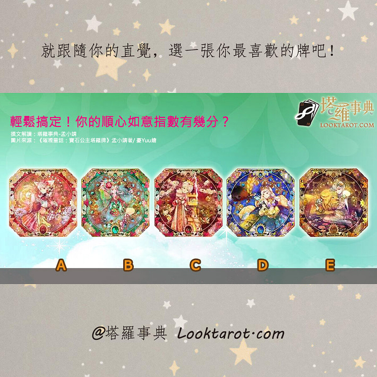 要是在生活之中,做起事來很流暢、很俐落。馬上就能完成你想要的成果,這不就是一件令人覺得開心的事嗎?想知道你面對生活大小事能順心如意嗎?快來玩孟小靖老師的塔羅占卜,看你現在的順心如意指數有多高吧!現在就跟隨你的直覺,請依照你的第一印象,選一張你最喜歡的塔羅牌吧。
