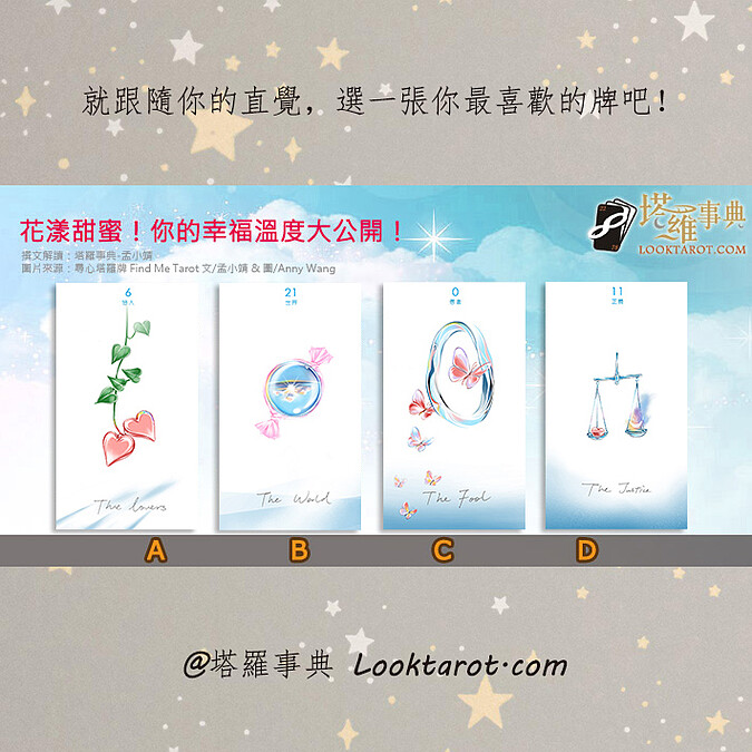 現在的你感覺幸福嗎?可以順心的去決定自己每天的行程,做些開心的事,無論是吃些美食、或是買些讓自己心頭好的小東西,到底對於目前的生活模式,你喜不喜歡呢?快來測孟小靖老師的塔羅占卜,看你的幸福溫度有多高吧。現在就跟隨你的直覺,請依照你的第一印象,選一張你最喜歡的塔羅牌吧。