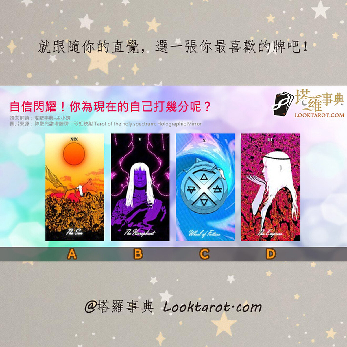 我們總是會在乎別人看自己的眼光,但有想過為自己打個分數嗎?對於現在的生活,還有自己的日常覺得滿意嗎?快來玩孟小靖老師的塔羅占卜就知道囉。讓最美的自己找回自信,就能閃耀出不同光采,現在就跟隨你的直覺,請依照你的第一印象,選一張你最喜歡的塔羅牌吧。