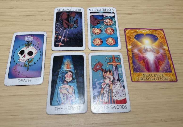 B組牌朋友們現狀死神牌正位, 26 年會迎來的驚喜好運是寶劍九逆位,星幣五逆位,隱士正位和寶劍國王正位,神諭卡是Peaceful resolution。
