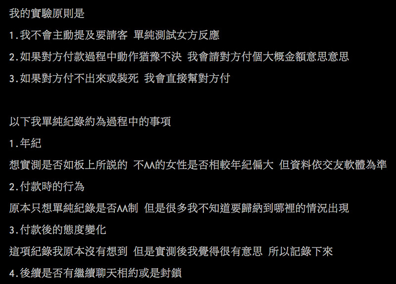 8 月 7 日,一名男網友發表第一次見面吃飯的AA制實際測驗,說自己針對約會 AA 制進行實測,他找來 19 位第一次見面的女生,分別記錄約會結帳時的狀況與兩人相處後續。
