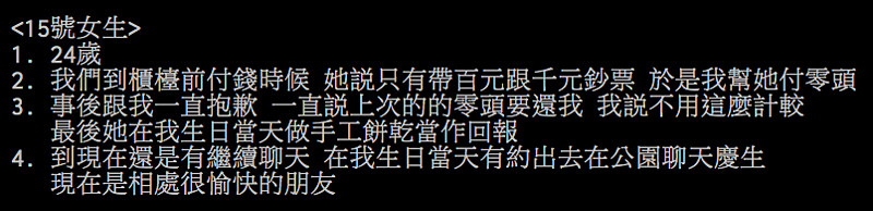 寫第一次見面吃飯的AA制實際測驗這篇文的男生,最後和網友狂推的 15 號女生在一起,能說全是因為 AA 制嗎?真要談 AA ,15 號女生花費心思為男生做餅乾、慶生,又該如何計算呢?