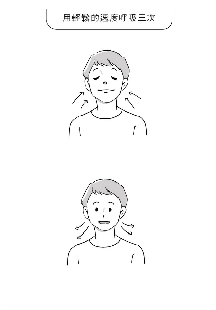 吸氣時,留意這些空氣會進入到身體的哪個部位,看看是進到了胸部或腹部,還有會吸進多少空氣,同時用輕鬆的速度呼吸三次。
