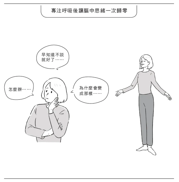這種時候,將注意力放在呼吸上,就能藉此使腦中的思緒一次歸零。這樣一來,才能找回內心的寧靜,才能讓思緒及情緒一次歸零,得以做出必要的判斷。
