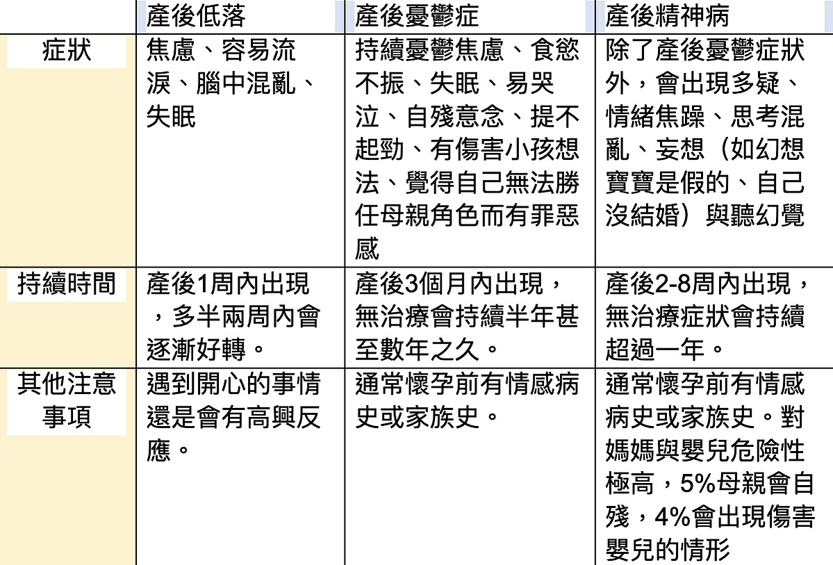身心科醫師周伯翰表示,產後憂鬱是一個通稱,依嚴重程度分成三種:「產後低落(baby blue)」、「產後憂鬱(postpartum depression)」以及「產後精神病(postpartum psychosis)」。產後低落(baby blue)」,約有50%的媽媽生產完後3-5天內會哭泣、哀傷、情緒敏感,這些症狀主因是生產後快速賀爾蒙變化、懷孕壓力得到釋放或開始體認媽媽的責任感與壓力而引起,多半二周內會改善。有近15%的媽媽症狀會持續憂鬱兩周以上進展為「產後憂鬱症」,另外約0.1%的媽媽會出現更嚴重的「產後精神病」,出現失去理智的思考與妄想症狀(如寶寶有缺陷、寶寶不是我的小孩),嚴重甚至會有傷害嬰兒的危險。
