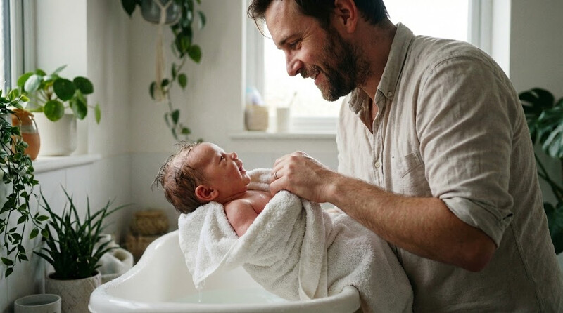 幫軟綿綿的新生兒洗澡常讓爸爸緊張。秘訣是動作及力道需輕柔,不要太過用力抓住寶寶。洗澡中要避免耳朵、鼻子、眼睛進水,且洗澡的時間控制在 10 分鐘以內最為合適,以免寶寶著涼。