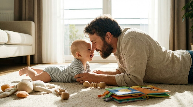 爸爸的遊戲方式通常與媽媽不同(可能更動態、更有冒險性)。在安全的情況下,爸爸可以放心讓孩子去嘗試不同年齡階段的遊戲,這對寶寶的智力發展和培養想像力有很大的幫助。