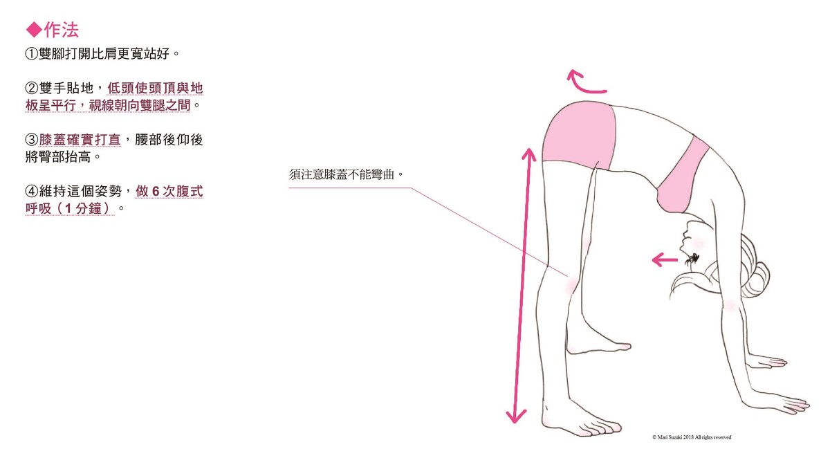 ③膝蓋確實打直,腰部後仰後將臀部抬高。