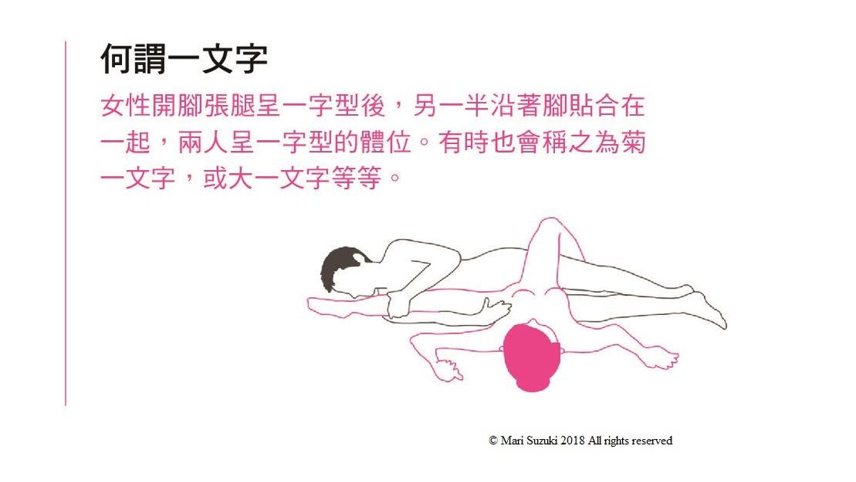 女性開腳張腿呈一字型後,另一半沿著腳貼合在一起,兩人呈一字型的體位。有時也會稱之為菊一文字,或大一文字等等。