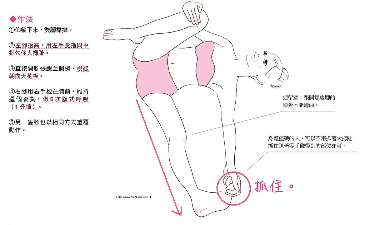 身體僵硬的人,可以不用抓著大拇趾,抓住膝蓋等手碰得到的部位亦可。