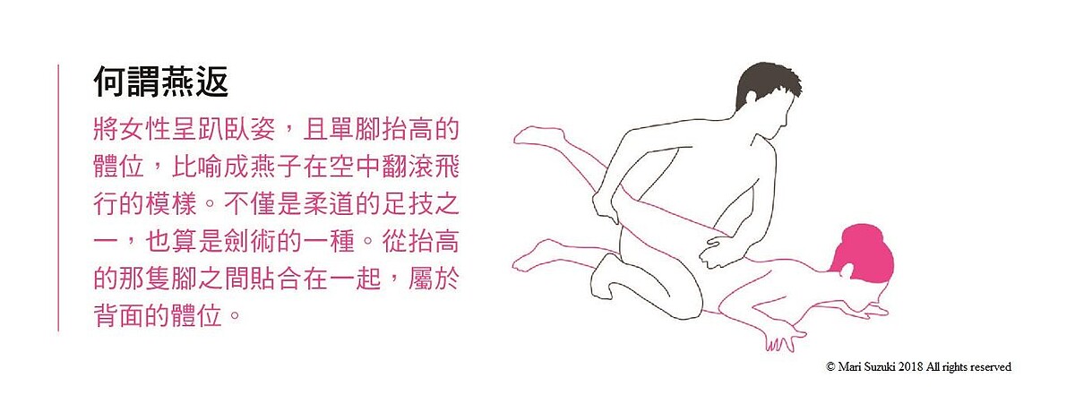 將女性呈趴臥姿,且單腳抬高的體位,比喻成燕子在空中翻滾飛行的模樣。不僅是柔道的足技之一,也算是劍術的一種。從抬高的那隻腳之間貼合在一起,屬於背面的體位。