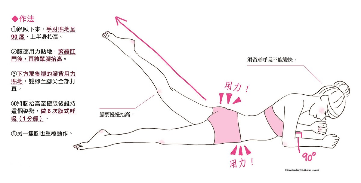 ②腹部用力貼地,緊縮肛門後,再將單腳抬高。