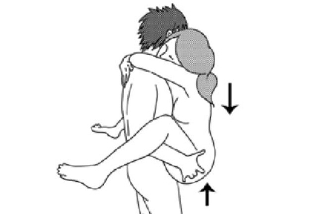 達人TIP:火車便當式是一個非常舒服的體位,女性脖子應該緊靠男性脖子,就不需要花費多餘的力量。男性手肘關節要固定在內角,小於90度,手臂肌肉才好施展力量,並以手肘內側支撐女性從膝蓋窩至臀部的大腿部位。手臂不移動,只有腰部動作,移動距離不超過10公分。