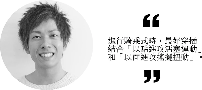 達人TIP:騎乘式中我最推薦「女性以直角角度跨騎在男性身上,前後搖擺扭動」,第二推薦「女性抱著男性,做上下活塞運動」。此時如果只有女性移動的話,動作會比較不穩定,建議男性以雙手扶著女性骶骨(背部和腰部交界之處的三角形骨頭部分),就能穩定動作不偏移。