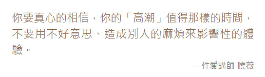 「有了那些制約的信念,更容易限制我們對於身體可能性的想像,當女人不夠相信自己的身體有無限的可能,可以體驗到不同種、不同強度的愉悅時,高潮就難以發生。」曉薇的語速時快時緩,能感受她迫切地把想法訴諸語言的焦急之感。