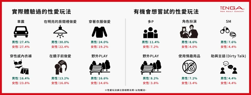 在性愛玩法調查中,除了每4人就有1人有過「車震」經驗,問到有機會想嘗試的性愛玩法,以「多人運動」占最多數,其他像是COSPLAY、SM、野砲等都有上榜。